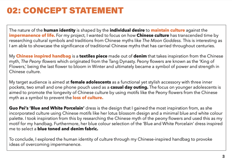 My Chinese-inspired handbag is a textiles piece made out of denim that takes inspiration from the Chinese myth, Peony flowers are known as the ‘King of Flowers,’ being the last flower to bloom in Winter and ultimately became a symbol of power and strength in Chinese culture.